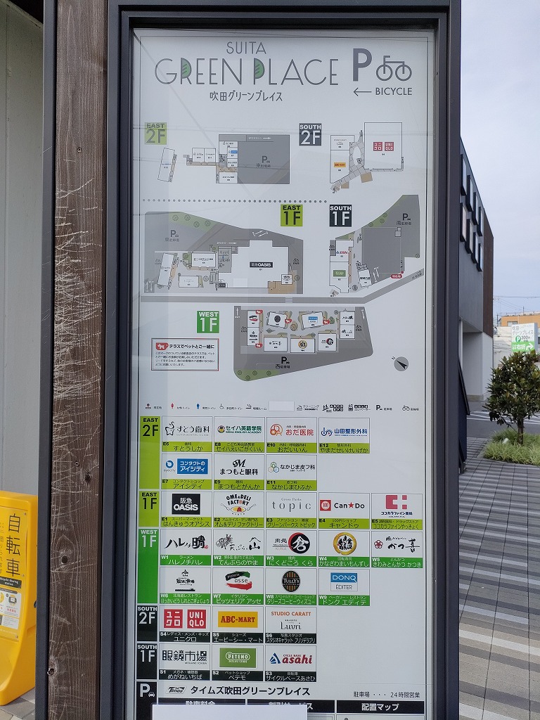 こちらは店舗利用者向けの案内板です。フィットネスや歯科、美容院などが入っていますね。