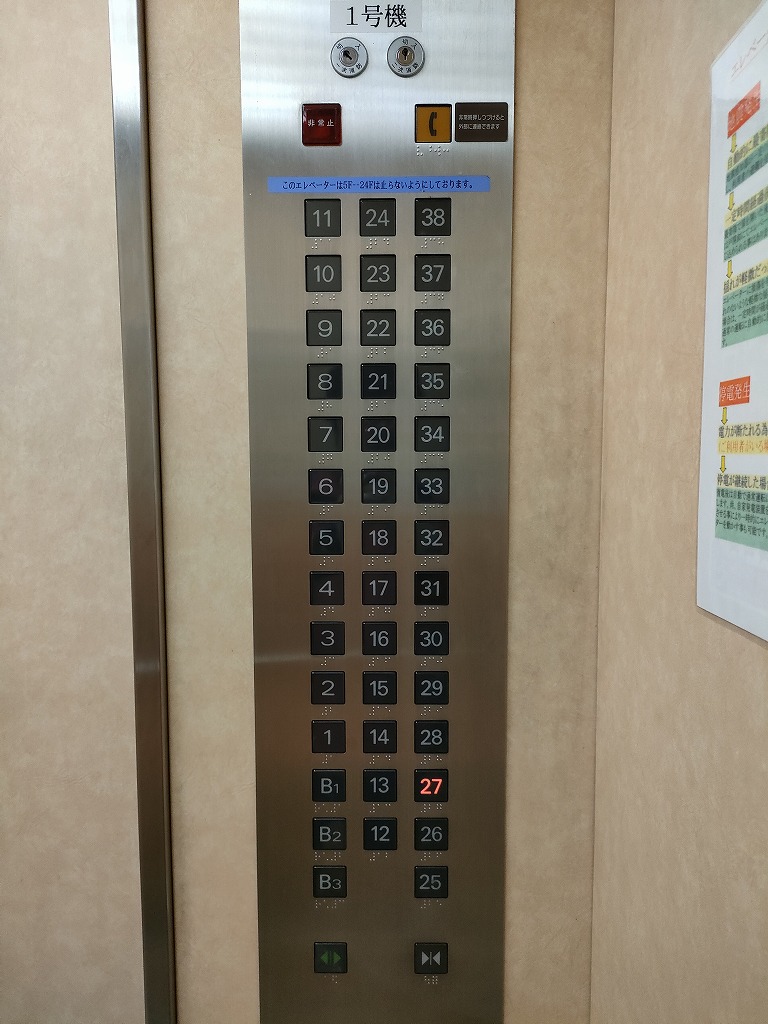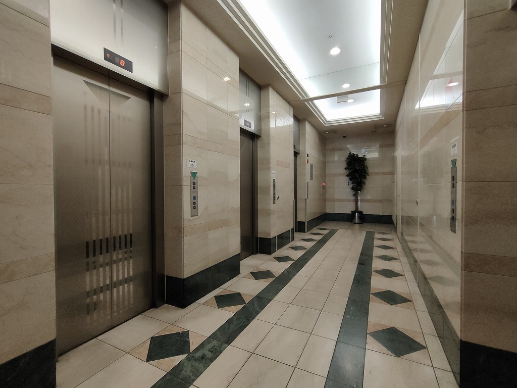 エレベーターホールの様子。居住者用のエレベータは4基が稼働しており、そのうち奥の2基が高層階用となっております。