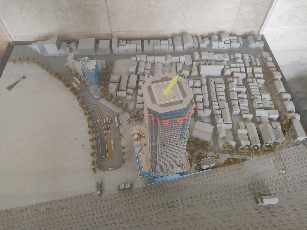 ロビーの傍らに縮小模型が設置されています。メロード吹田一番館の屋上はヘリポートになっており、実際の様子はグーグルマップの航空写真でも確認が可能です。