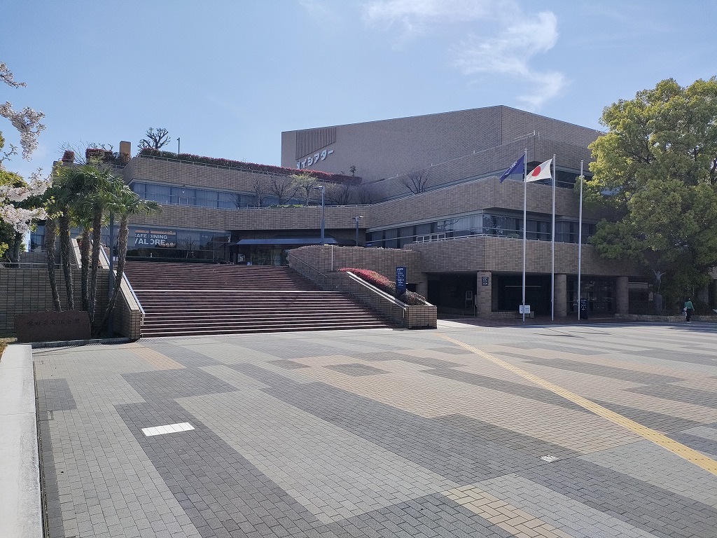 駅の東口を出てすぐの場所にある、吹田市文化会館(メイシアター)。成人式など市の行事が行われる他、大ホールでは NHK の公開収録のようなビッグイベントがあることも。