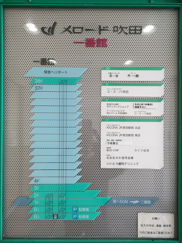 前述の通り、メロード吹田(一番館)は JR 吹田駅に隣接する、このエリアでは唯一となるタワーマンションです。5階より上が住居となっており、1~3階はテナント、地下は3階までが駐車場となっています。