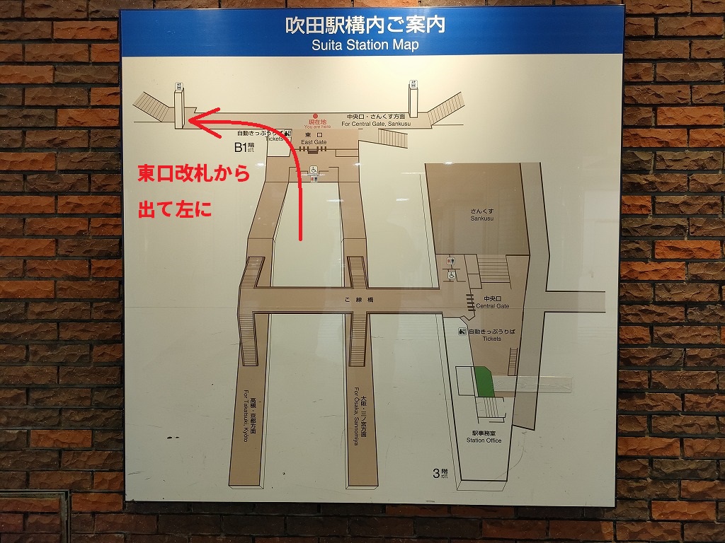 吹田駅は改札が二つあります。さんくすを利用したい時は中央口、メロード吹田に向かう時は地下改札の東口から出て左に進んで下さい。