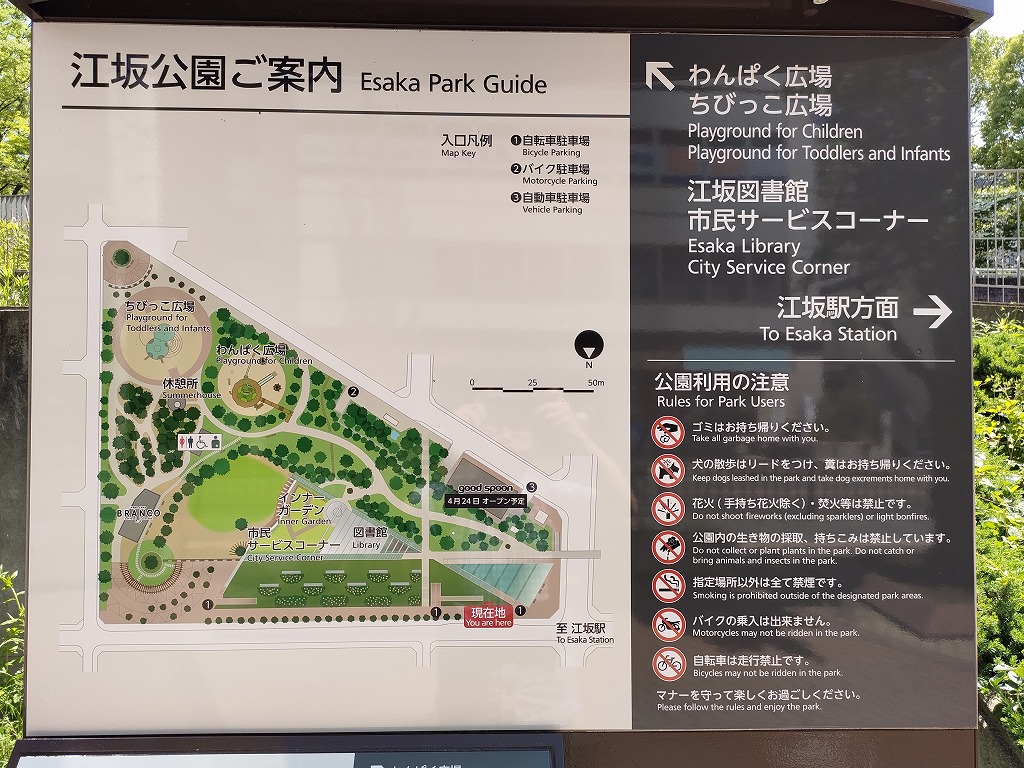 駅の東側には江坂公園があります。この場所には図書館も併設されているのですが、この春どちらもリニューアルされてとても魅力的な公共施設となりました。