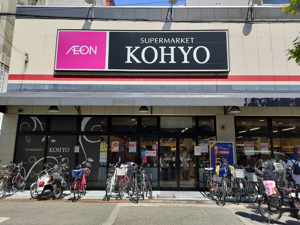 駅周辺にはフレスコ、グルメシティ、関西スーパー、業務スーパーがある。物件への帰路上にあるのは写真の光洋