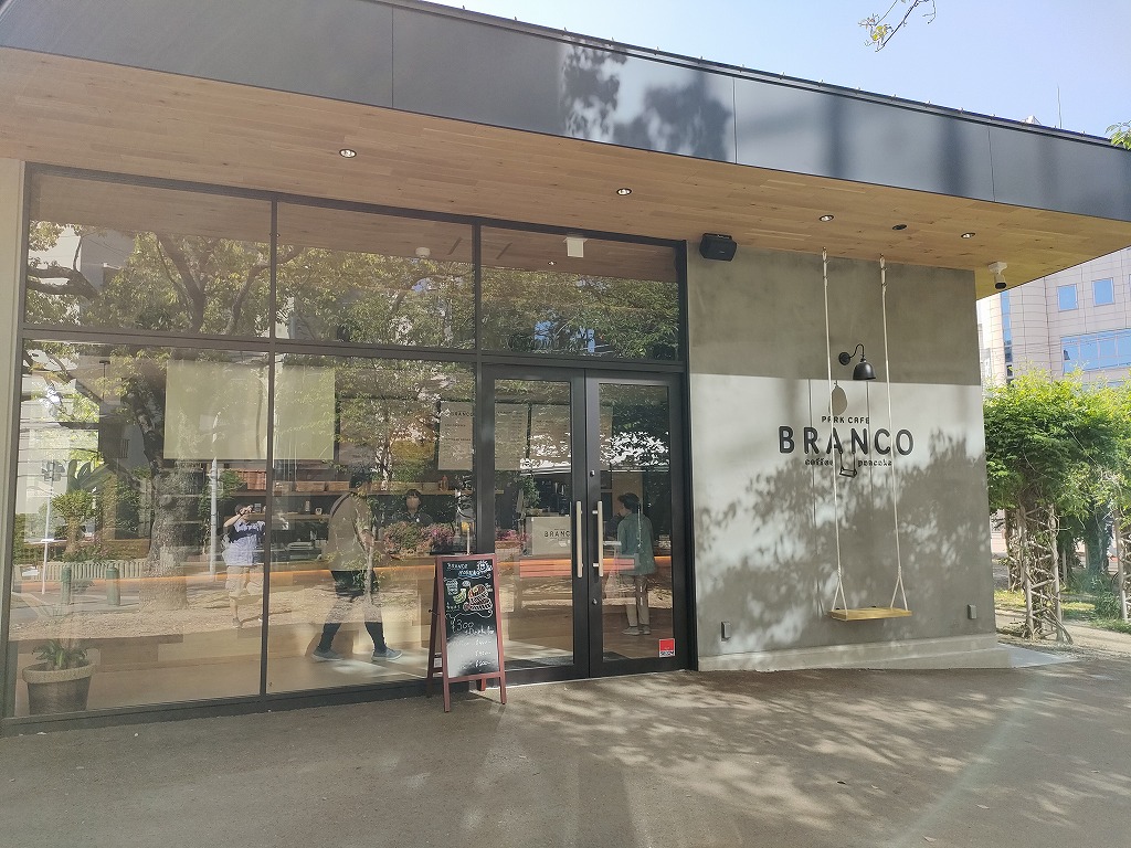 カフェ BRANCO 。スマホを構えている怪しいおっさんがガラスに映っていますね笑