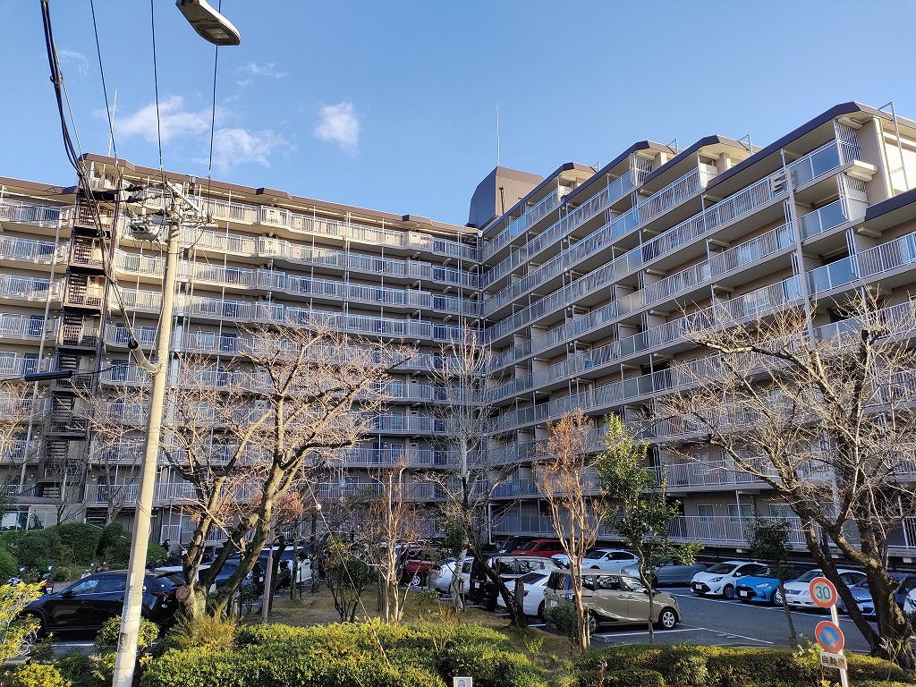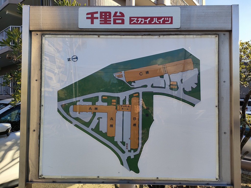 千里台スカイハイツは全3棟からなる、総戸数 438 のマンションです。C棟は公道を隔てた向かい側にあるあたり、規模の大きさを感じさせます。