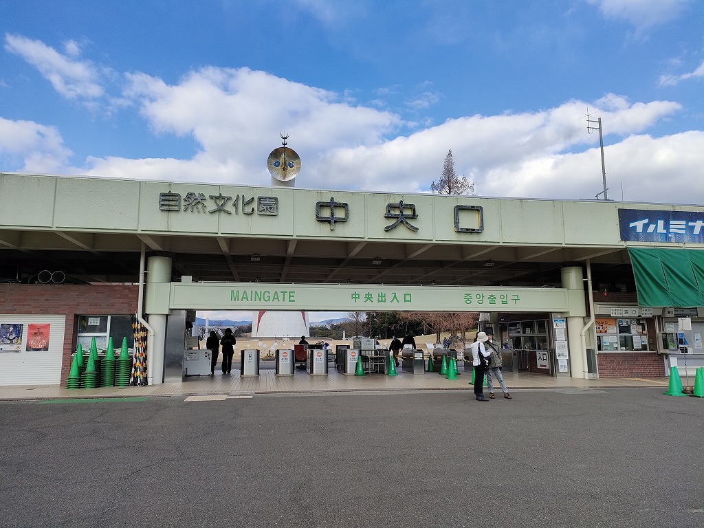 駅を出るとすぐ見えてくる、太陽の塔。そのお足元に万博記念公園(自然文化園)の入り口ゲートがあります。