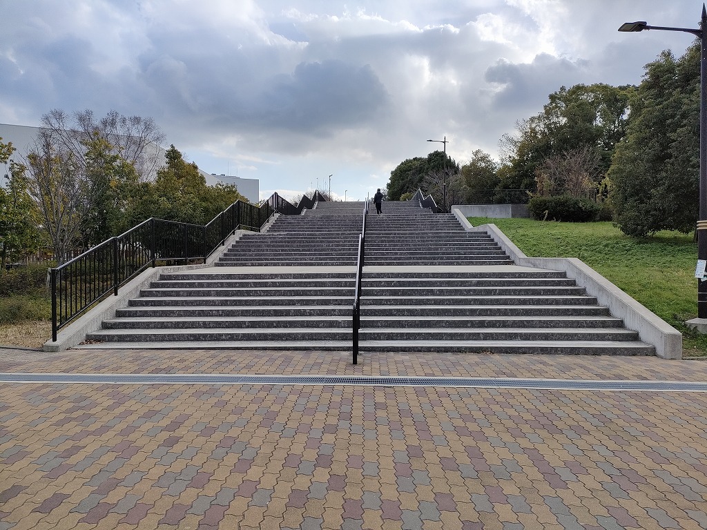 シティから千里台スカイハイツへ向かうため、記念公園南口を目指して歩いていきます。まずはこの階段を進んで下さい。