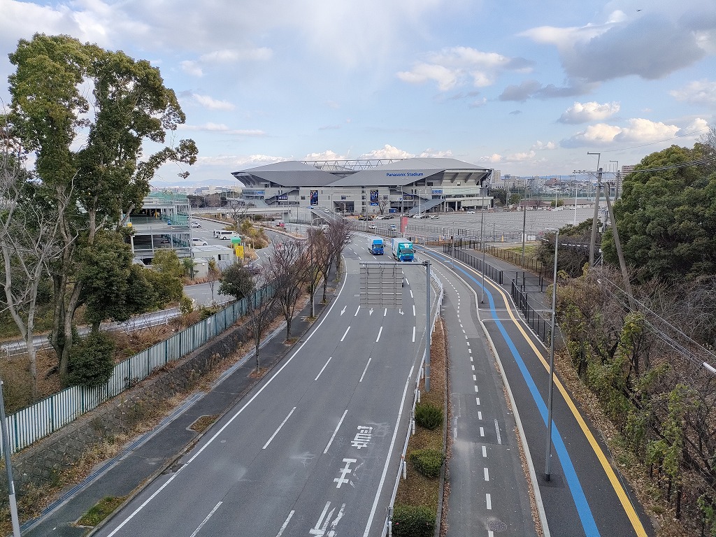道程にはサッカーチーム・ガンバ大阪の本拠地、パナソニックスタジアムが見える高架橋があります。マンションから歩いて行ける距離ですね。