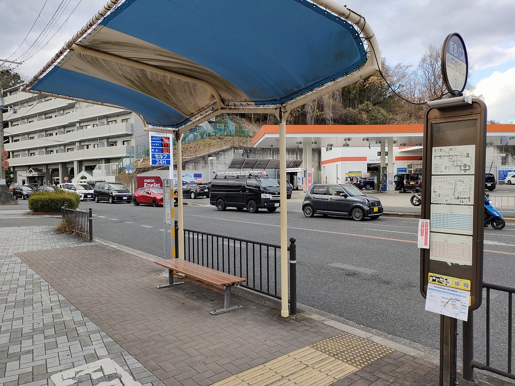 ガソリンスタンドのある交差点を右に曲がるとすぐ、バス停(阪急バス:山田樫切山)があります。ここがマンションに最も近いバス停で、阪急千里線の山田駅、北大阪急行電鉄の千里中央駅に行くことが出来ます。