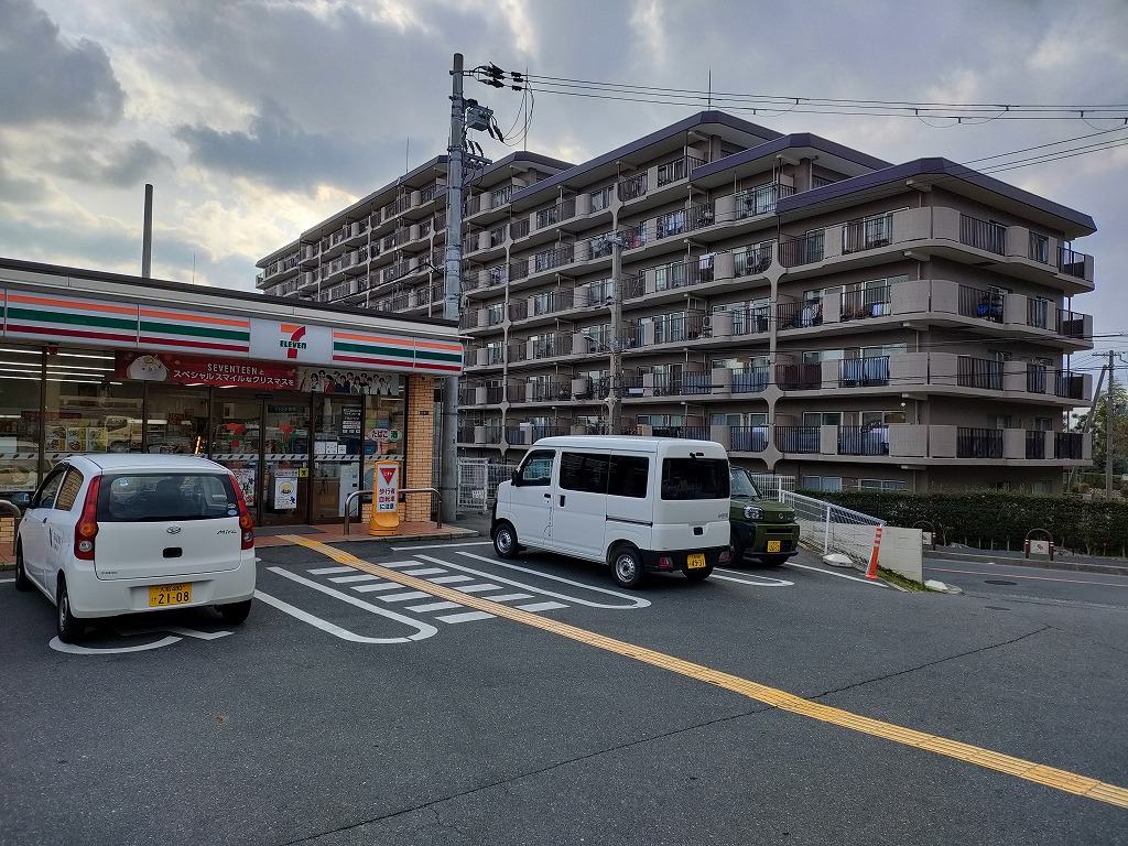 バス停を超えて直進で見えてくるセブン・イレブンが、マンションに隣接するコンビニです。奥に見えているのがA棟ですね。C棟はこのセブンとA棟の間にある道を下って頂ければすぐ到着となります。お疲れさまでした。