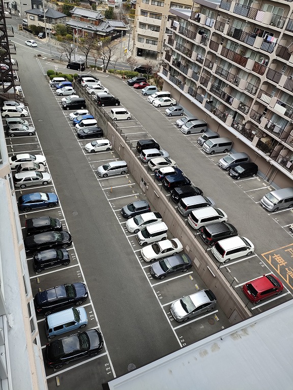 敷地内の駐車場は自走式一部立体、計220台の規模ですが、残念ながら空き待ちが10世帯ほどいらっしゃるとのことです。お車をお使いのお客さまについては、近隣の月極駐車場をご案内させて頂くことになります。