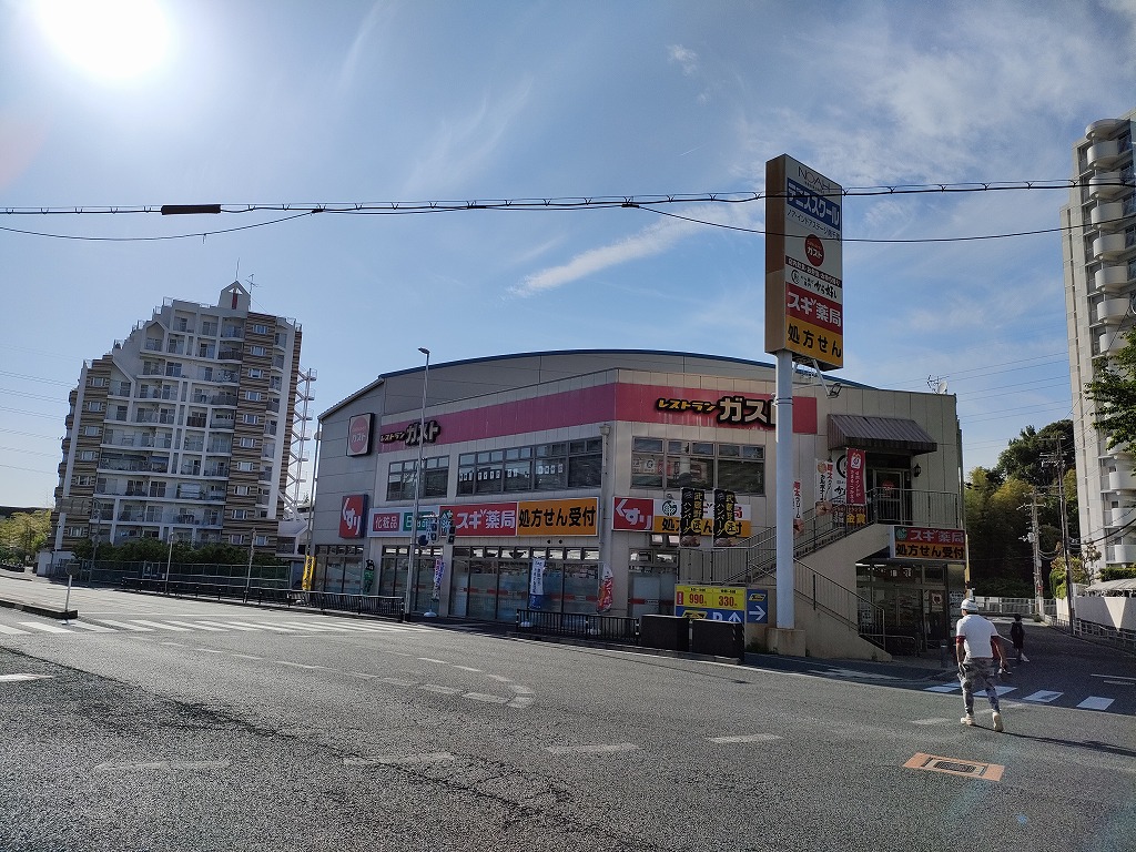 最後に、マンションからすぐ近くの施設に目を向けてみましょう。隣にはガスト、テニススクール、薬局が一緒になった建物があります。ご近所さんとお茶する時はここが便利。