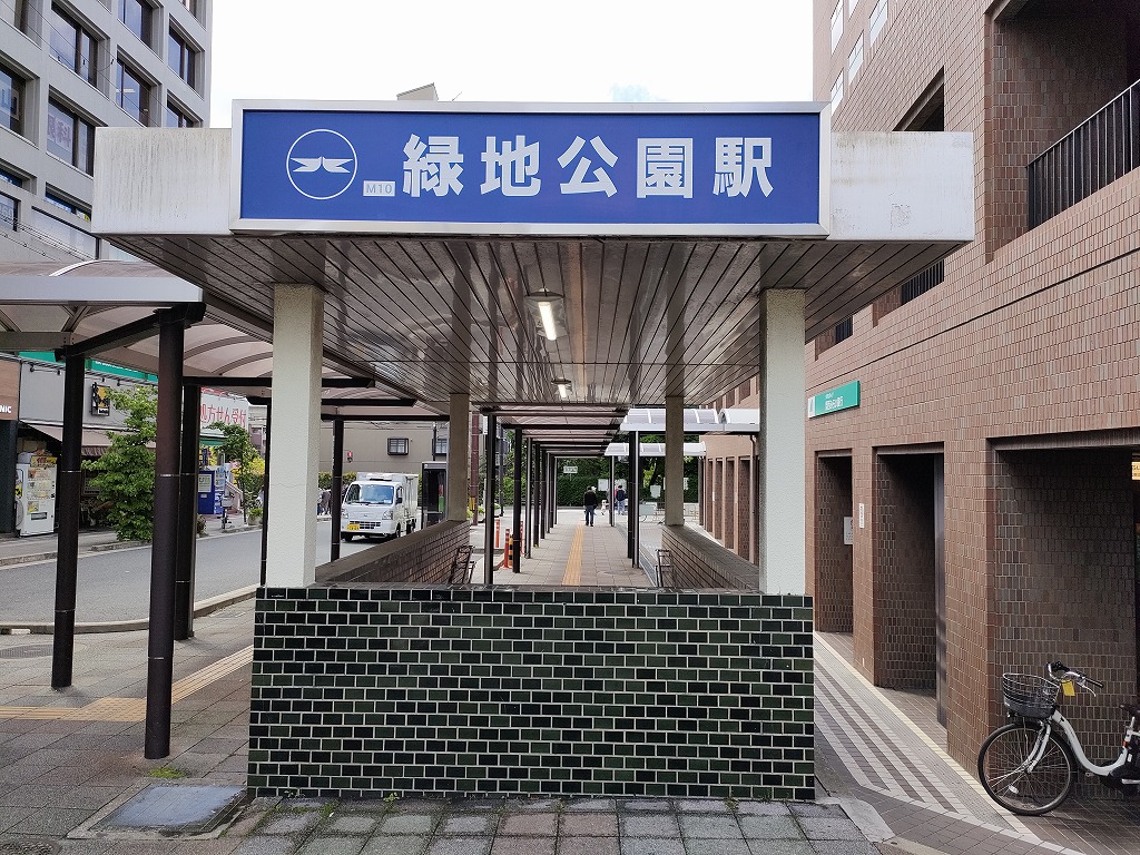 最寄駅は北大阪急行電鉄の緑地公園駅。念の為補足しておくと、北急線は大阪メトロ御堂筋線と相互直通運転となっており、例えば梅田駅から千里中央行の電車に乗れば、乗換など無くそのまま緑地公園に到着します。写真は日商岩井緑地公園マンションの居住者が最もよく利用する西口です。