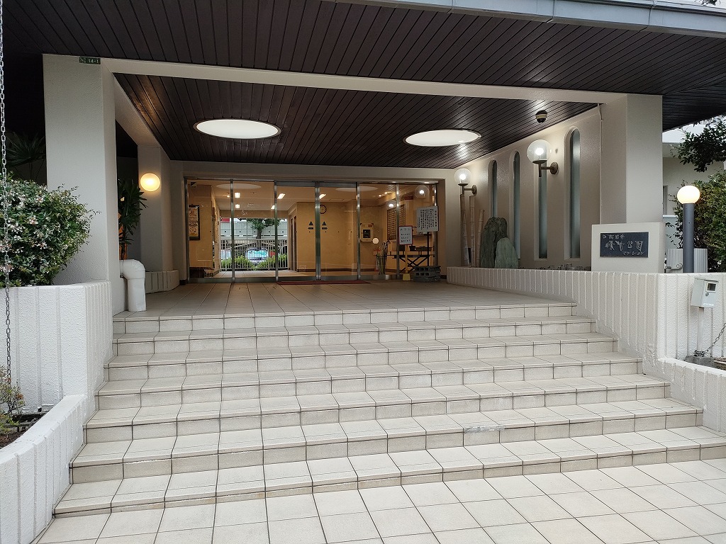 エントランスの様子。一見階段のみと見えますが、横に車いす用のスロープもちゃんとあります。共用部のバリアフリー化は問題ありませんし、緑が多くあしらわれているのも好印象ですね。