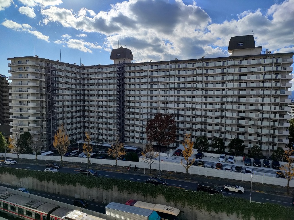 日商岩井緑地公園マンションは地上14階建、総戸数 290 を超える大規模マンションです。建物はL字型となっており、バルコニーは南、西のいずれかに向いています。最も多いのは西向きの住居で、上の写真は東側から撮影した時の姿です。