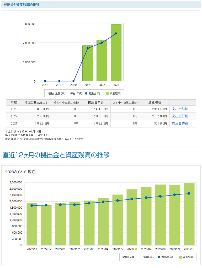 というわけですので、簡単にお見せ出来る資産の推移は、移管した 2021年からの記録となります。グラフは折れ線が拠出総額、縦棒が資産総額。折れ線が低下することはありませんが、縦棒は当然ながら実績により上下します。