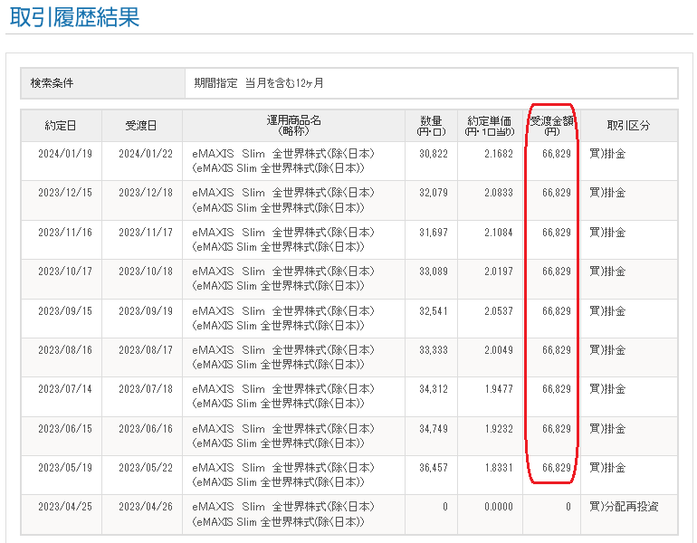私は月に 67,000円を拠出していますが、実際は手数料が引かれた 66,829円で投資信託の買付を行っている、という訳です。この事務手数料についてはどこの金融機関を選択しても免れませんので、みんなが払うお布施であると考えて下さい。