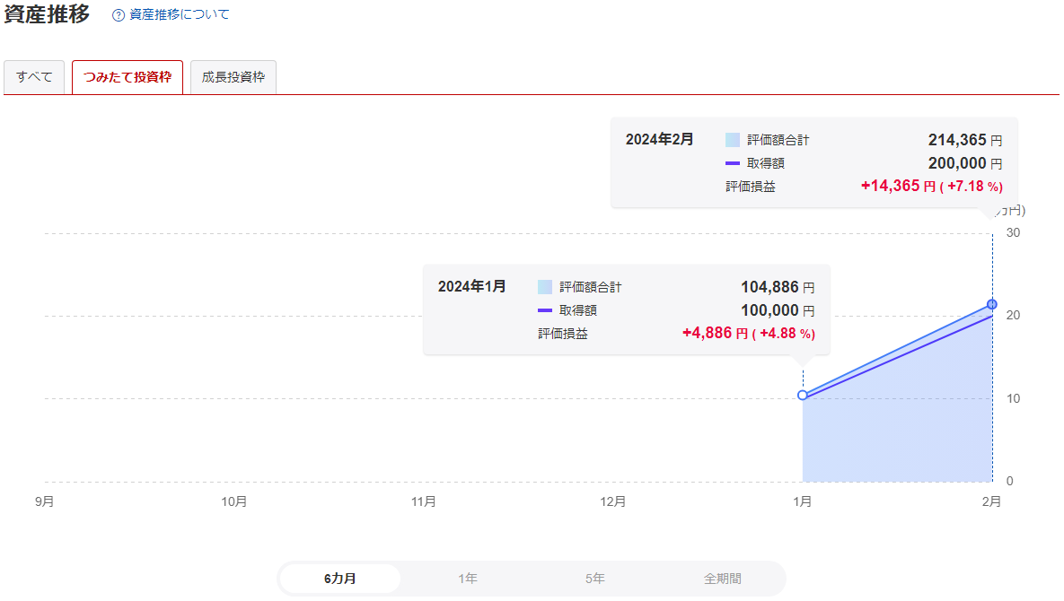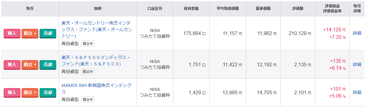 ●最新の運用成績として、これまでの投資額(200,000円)に対し 14,365円 の含み益(赤い字)が出ており、その結果、評価額合計が 214,365円 と増加