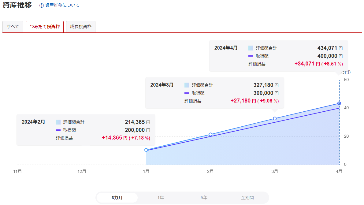 ●最新の運用成績として、これまでの投資額(400,000円)に対し 34,071円 の含み益(赤い字)が出ており、その結果、評価額合計が 434,071円 と増加