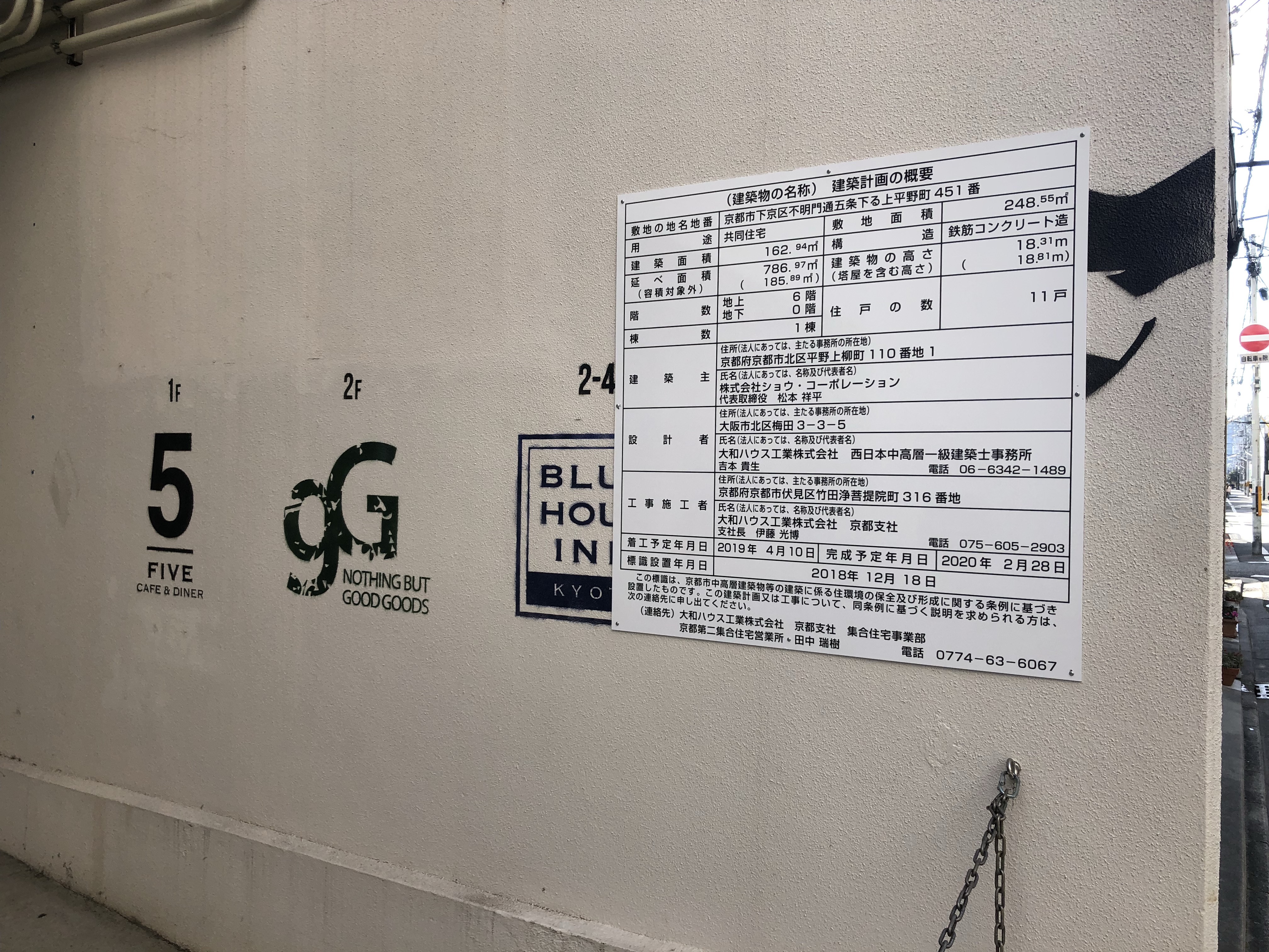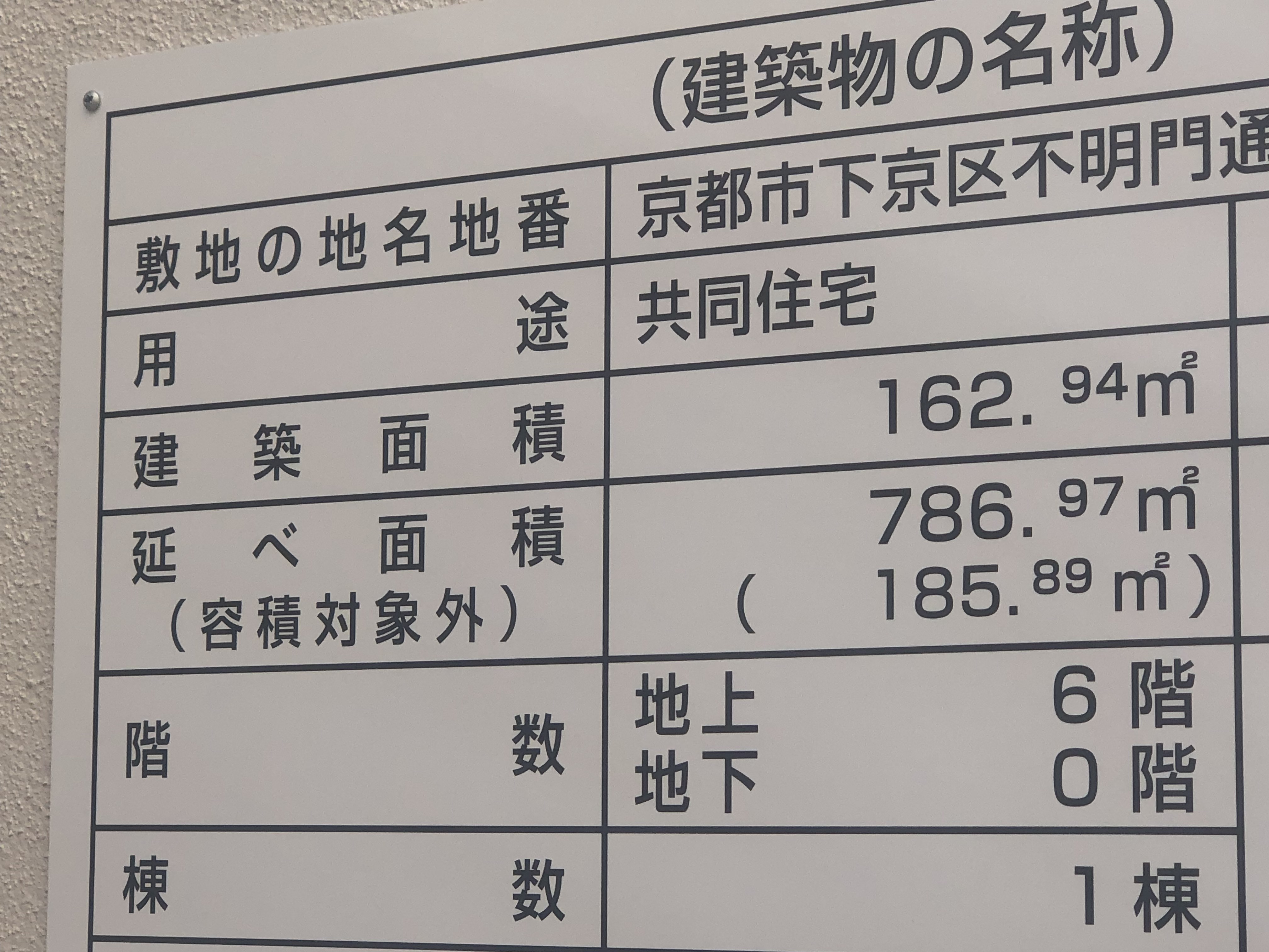 写真は工事前に現場に掲げられる「建築計画の概要」、いわゆる「おしらせ看板」。不動産業界にいる人間が必ずチェックするアレです。ここ2〜3年に京都市内を歩いた人なら見飽きていることでしょう。なにせ市内中心部は宿泊施設の建築ラッシュ。明らかにバブル時以上の開発が実施されています。コンビニより多いおしらせ看板。全く珍しくもなんともありません。