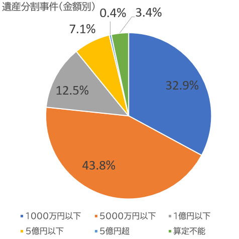 また、 令和3年司法統計年報によりますと、遺産分割事件として取り扱われた件数のうち、遺産金額が5,000万円以下の事件が実に76.7%もあったことが分かります。