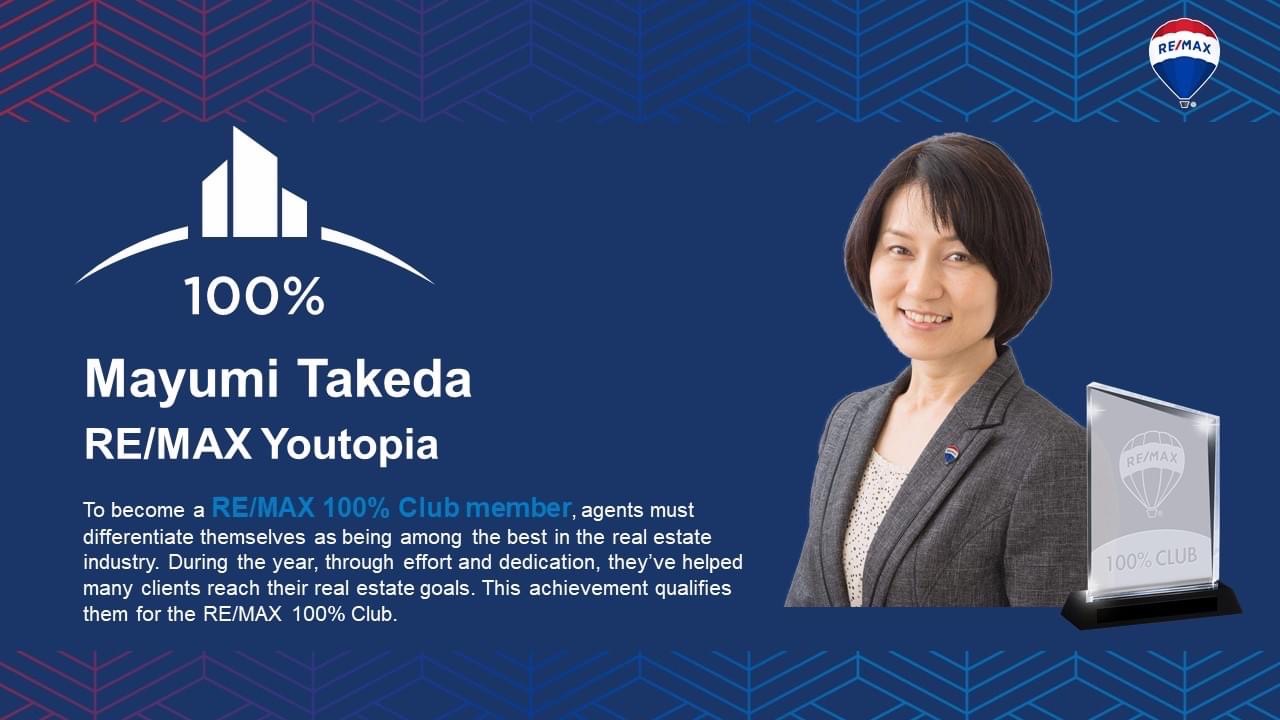 アメリカ本部のRE/MAXからも100%の賞を頂きました