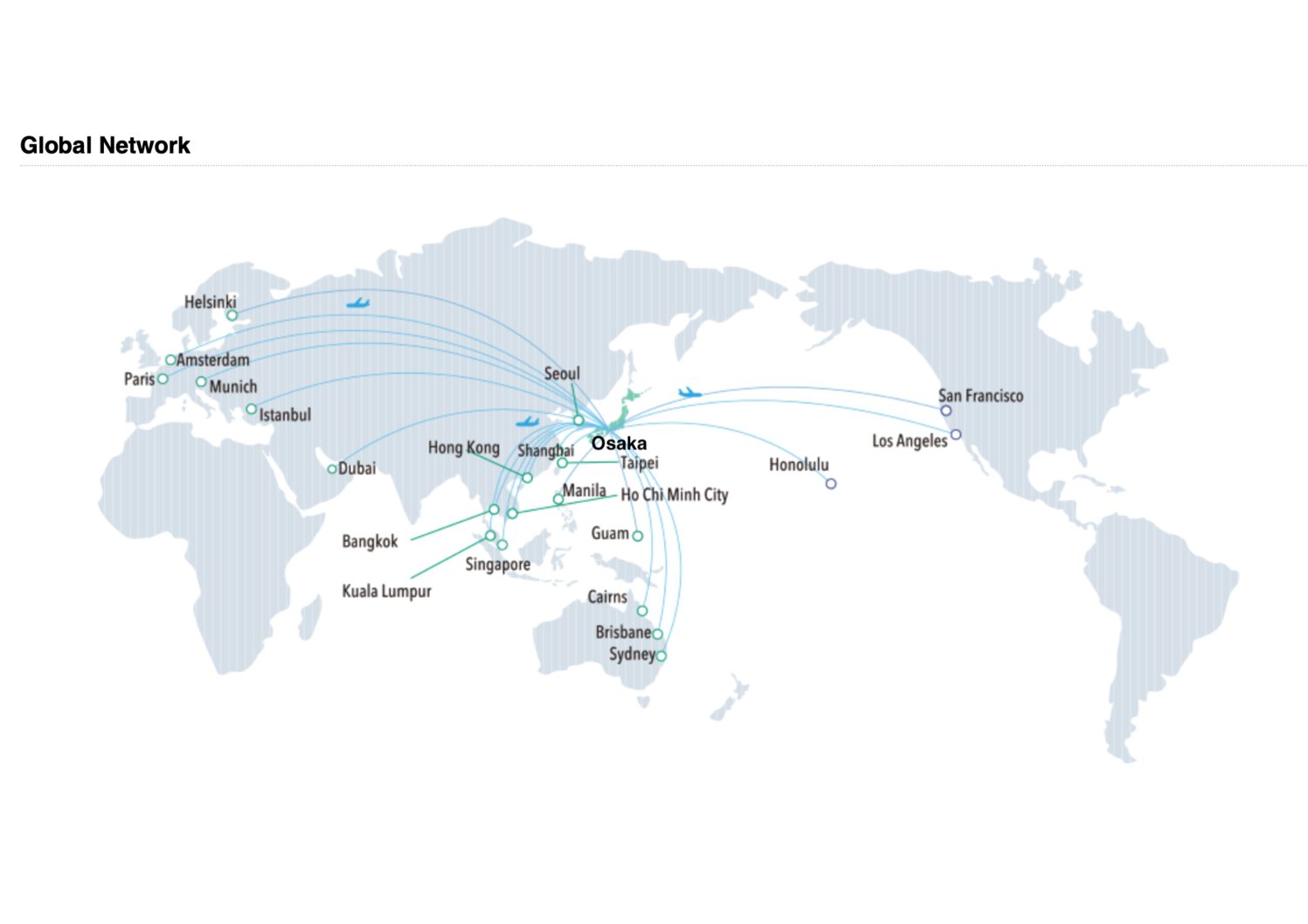 With worldwide routes connecting to 19 regions and countries and 49 cities (as of summer, 2024), Kansai International Airport – Japan's 24-hour operating airport hub – supports business travel and exchanges of people between Osaka, Asia, and the world.