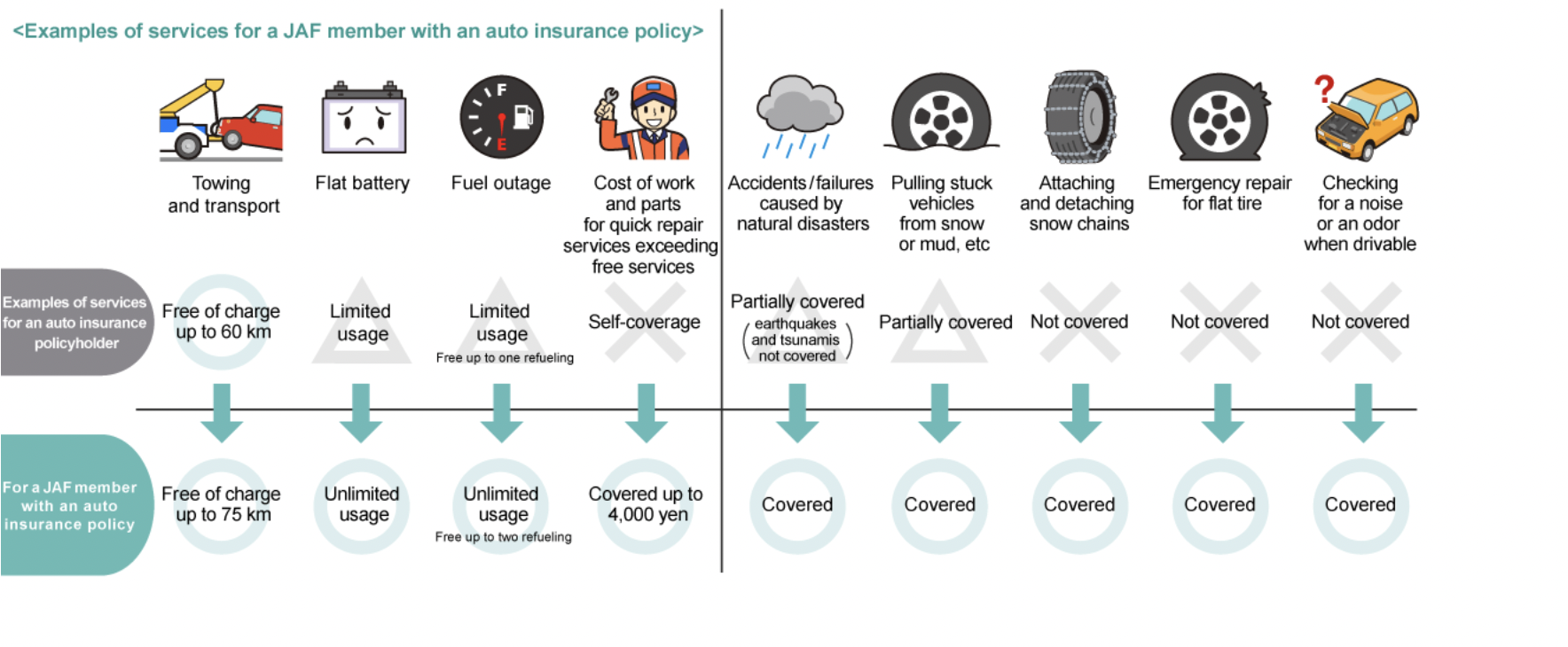 This itself is not insurance; however, it will benefit you enormously if you decide to get it. JAF stands for Japan Automobile Federation. Their aim is to assist you during any unprecedented road troubles. They help you deal with minor problems that could be a real headache when encountered, such as a flat tire, keys locked in the car, dead batteries, fuel outage and towing problems. They are available 24/365 and have an excellent track record of over 50 years. They accept most vehicle types and even help you with your car during natural disasters.