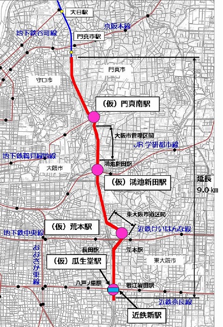 The planned extension section of the Osaka Monorail Main Line is 9.0km from Kadoma City to Uryudo. On the way, we will set up additional 4 stations: Kadoma-Minami, Konoikeshinden, Aramoto and Uryudo. The one station will be set up adjacent to the Higashi-Osaka City Hall. A garage will be set up on the unused land on the Route2 to the north of Uryudo, the final stop.
